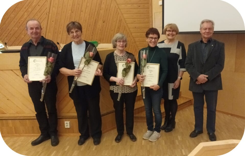 Hopeinen ansiomerkki luovutettiin neljälle hallituksessa työskenneelle jäsenelle.