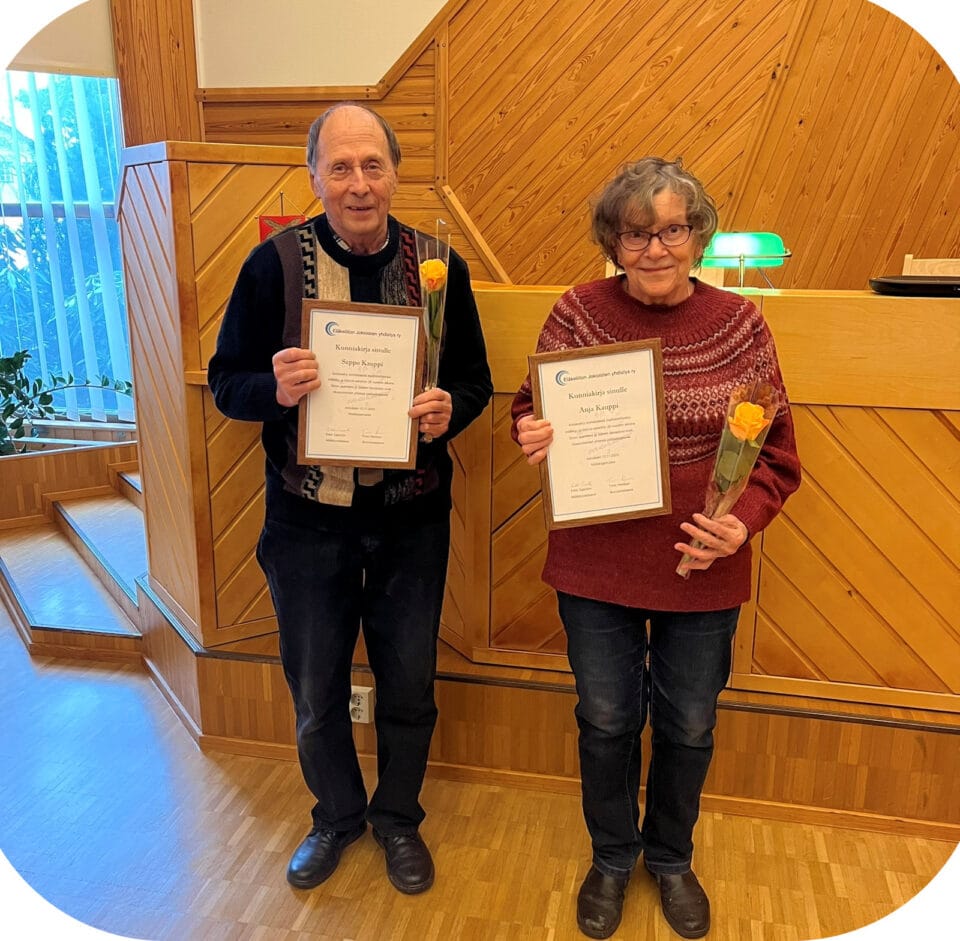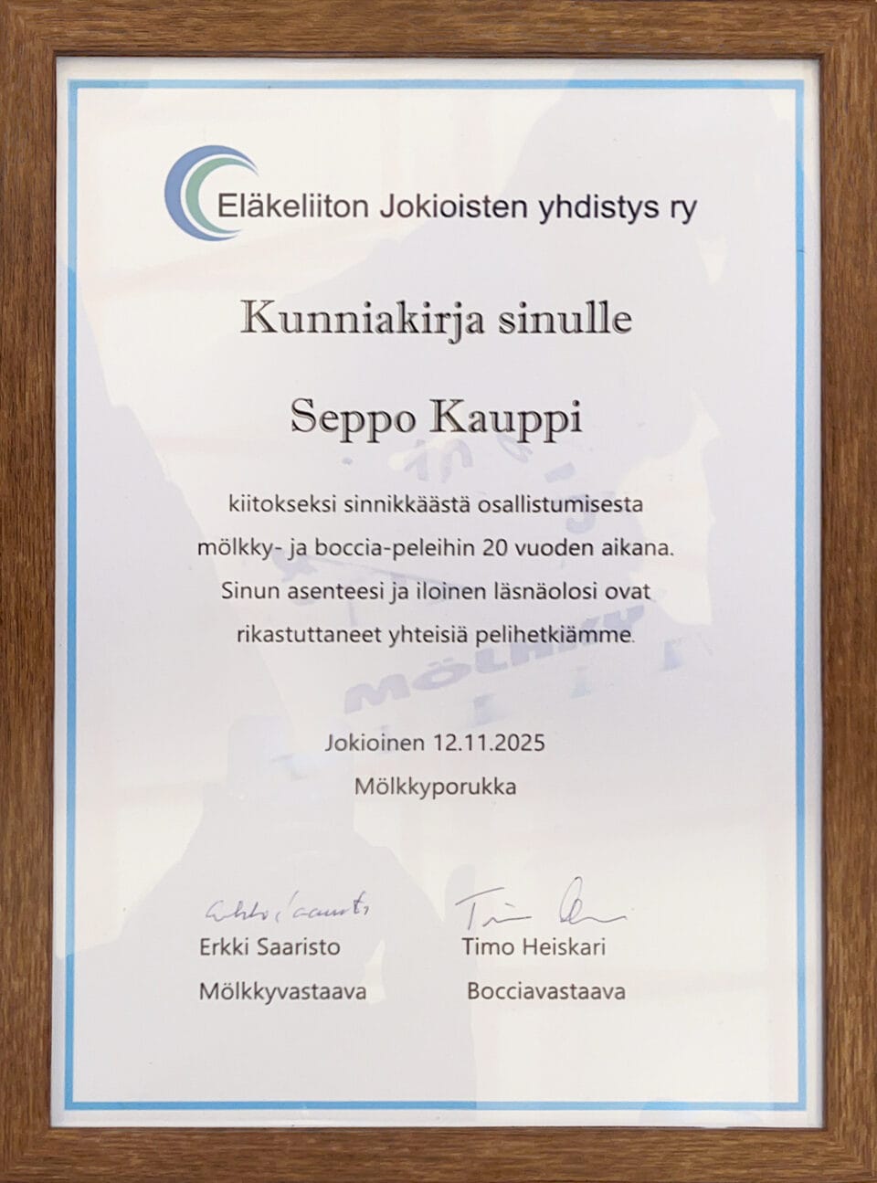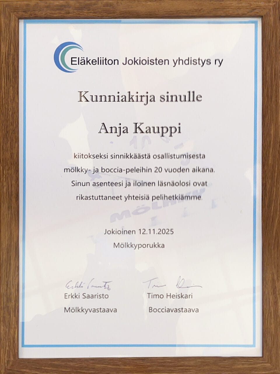Kunniakirjat jaettiin kiitoksena sinnikkäästä osallistumisesta mölkky- ja boccia-peleihin 20 vuoden aikana Anja ja Seppo Kaupille.